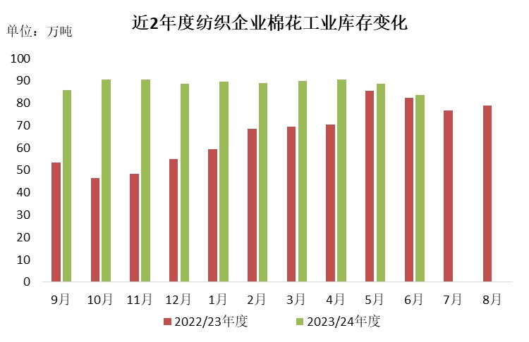 6月,國內(nèi)棉花市場供應充足、需求較弱的格局持續(xù),紡織下游依然處于淡季,銷售率下降,成品庫存繼續(xù)增加,企業(yè)回款壓力較大,資金流轉(zhuǎn)緊張,缺乏補庫動力,棉花采購意愿低迷,對后市信心仍然不足,開機率小幅下調(diào)。據(jù)中國棉花預警系統(tǒng)對全國90余家定點紡織企業(yè)調(diào)查顯示,紡織企業(yè)開工及產(chǎn)能環(huán)比下降,成品庫存繼續(xù)增加,原料庫存有所下降。