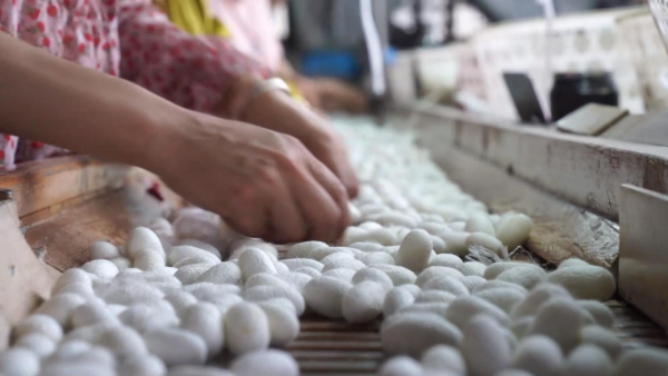 為了保障蠶絲生產(chǎn)質(zhì)量,收購回來的蠶繭需要立馬進(jìn)行烘干處理。烘干完成的蠶繭需要經(jīng)過精挑細(xì)選,剔除殘次繭后,才能被運(yùn)往加工車間進(jìn)行加工。在云南錦冠絲綢有限公司繅絲加工車間內(nèi),自動(dòng)化機(jī)械設(shè)備不停運(yùn)轉(zhuǎn)。一顆顆質(zhì)量上乘的蠶繭在經(jīng)過煮繭、繅絲、浸絲、復(fù)搖、編絲、整理、檢驗(yàn)、打包等流程后,才能變成了成品絲線。每個(gè)環(huán)節(jié)嚴(yán)格把關(guān),生產(chǎn)出來的優(yōu)質(zhì)絲線才能走向市場(chǎng)。