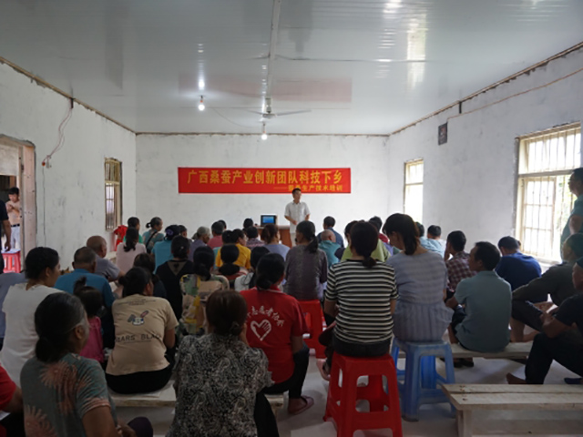 專家組深入蠶區(qū)合作社、家庭農場、養(yǎng)蠶戶進行蠶桑生產現(xiàn)場指導,并開展技術培訓。在環(huán)江縣和宜州區(qū)舉辦的技術培訓班上,專家組給蠶農群眾講授了蠶、桑病蟲害防治關鍵技術和夏季桑園管護技術。累計培訓人員163人次,發(fā)放技術資料85份。