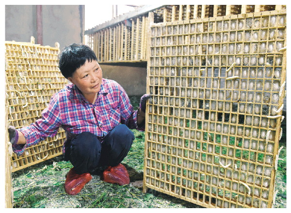 蠶農(nóng)在查看蠶蟲(chóng)爬上蠶蔟結(jié)繭