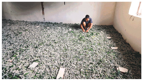 蠶農(nóng)在查看蠶蟲(chóng)生長(zhǎng)情況