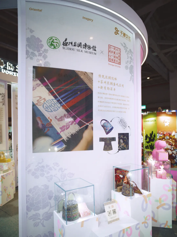 近年來,蘇州絲綢博物館積極探索國有事業(yè)、國有企業(yè)、民營企業(yè)“1+1+N”的IP授權(quán)模式。本次展會,蘇州絲綢博物館現(xiàn)場展示了由千鯉文化代理的IP授權(quán)項目。千鯉文化是國內(nèi)專注版權(quán)運營的品牌管理公司,2021年成為蘇州絲綢博物館IP版權(quán)運營方,圍繞館藏資源和非遺技藝,開發(fā)二十多套主題圖庫,應(yīng)用于市場品牌合作,為傳播蘇州絲綢文化、培育博物館品牌價值進行市場化創(chuàng)意賦能。