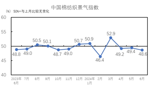 中國(guó)棉紡織景氣指數(shù)連續(xù)三個(gè)月處于臨界點(diǎn)以下。6月份中國(guó)棉紡織景氣指數(shù)為48.6%,較5月下降0.8個(gè)百分點(diǎn)。進(jìn)入6月,棉紡織行業(yè)市場(chǎng)整體無(wú)明顯變化,淡季行情持續(xù),需求維持弱勢(shì),下游企業(yè)銷售不暢,經(jīng)營(yíng)壓力持續(xù)累計(jì),棉紡織行業(yè)景氣水平處于臨界點(diǎn)以下。從分項(xiàng)指數(shù)看,構(gòu)成中國(guó)棉紡織景氣指數(shù)的7個(gè)分項(xiàng)指數(shù)中,原料采購(gòu)指數(shù)、原料庫(kù)存指數(shù)、生產(chǎn)指數(shù)、產(chǎn)品銷售指數(shù)、產(chǎn)品庫(kù)存指數(shù)、企業(yè)經(jīng)營(yíng)指數(shù)、企業(yè)信心指數(shù)均低于臨界點(diǎn)。7個(gè)分項(xiàng)指數(shù)中產(chǎn)品銷售指數(shù)、產(chǎn)品庫(kù)存指數(shù)較5月出現(xiàn)上升,其余指數(shù)較5月出現(xiàn)下降。
