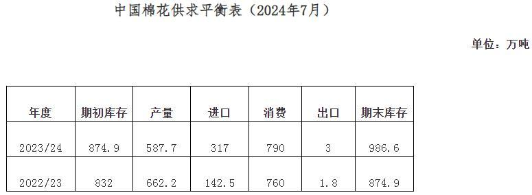 6月,我國國民經濟運行總體平穩(wěn),穩(wěn)中有進。國內棉市供應寬松格局依舊,紡織行業(yè)仍處淡季,需求尚待恢復,企業(yè)購銷不佳,成品庫存持續(xù)增加,后市信心不足,原料采購以隨用隨購為主,開機率逐漸下調。國內外棉價運行維持弱勢,均小幅下跌,內外棉價差震蕩收窄。新疆和黃河流域棉區(qū)大部棉花處現蕾至開花期,長江流域大部處第五真葉至現蕾期,部分地區(qū)進入開花期。新疆棉區(qū)氣候適宜,利于棉花生長,大部分棉花長勢好于去年;內地棉區(qū)北旱南澇,棉花長勢差于去年。中國棉花協會預測2023/24年度,全國棉花產量587.7萬噸,同比下降11.3%;棉花進口量317萬噸,同比增長1.2倍;消費量790萬噸,同比增長4%;期末庫存相應調整為986.6萬噸,同比增長12.8%。