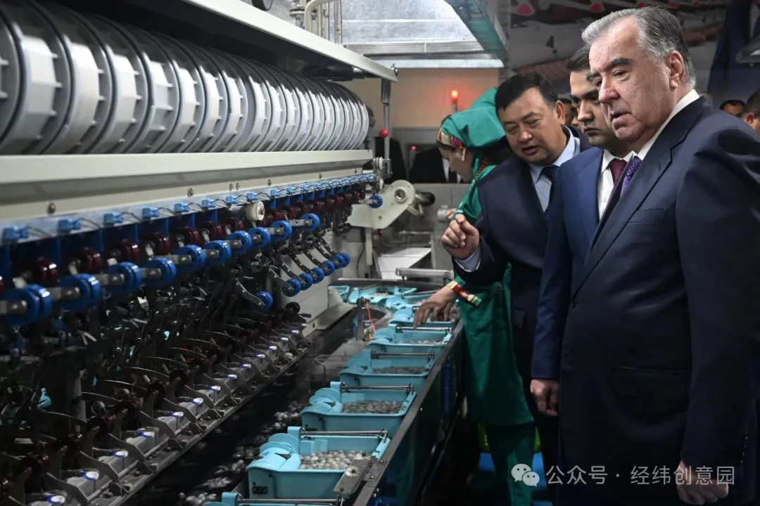 △塔吉克斯坦總統(tǒng)埃莫馬利·拉赫蒙觀看自動(dòng)繅絲機(jī)生產(chǎn)情況