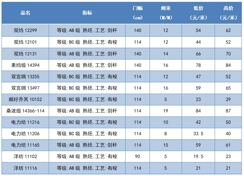 本周綢緞指數(shù)協(xié)作單位成交價格區(qū)間