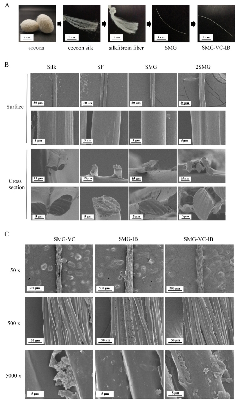 本研究通過(guò)從蠶絲中提取絲素蛋白纖維制備縫線,如圖1所示,先使用堿性溶液去除蠶絲的絲膠,獲得絲素蛋白纖維(SF),將SF甲基丙烯酸化(SF-MA),然后與GelMA交聯(lián)形成SF-MA-GelMA縫線(SMG)。單鏈SMG的直徑約為15 μm。GelMA涂層使縫線更緊密地聚集,也為IB和VC提供支持和保護(hù),從而使藥物隨著GelMA的降解而釋放。