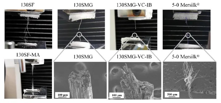 圖3結(jié)果顯示,130SF和130SF-MA截面松散,說(shuō)明內(nèi)部纖維是一根一根斷裂。130MG和130MG-VC-IB緊密結(jié)合,區(qū)域內(nèi)所有纖維均勻分擔(dān)斷裂力,使斷裂截面整齊均勻,斷裂強(qiáng)力更大。5-0蠶絲編織線,內(nèi)部纖維應(yīng)力相似,斷裂截面整齊均勻,但縫線輪廓內(nèi)部是松散的。