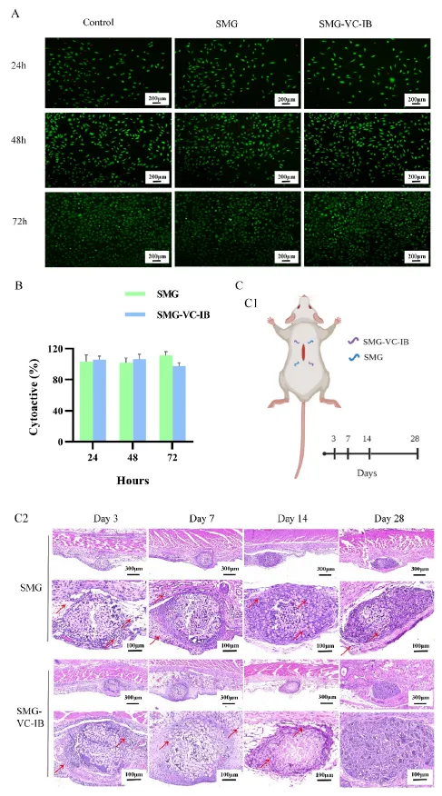 細(xì)胞毒性試驗(yàn)結(jié)果顯示,隨著時(shí)間的推移,成纖維細(xì)胞的數(shù)量急劇增加,SMG、SMG-VC-IB和對(duì)照組之間沒(méi)有差異。CCKS試驗(yàn)也顯示,SMG和SMG-VC-IB組保持良好的細(xì)胞活力,揭示SMG和SMG-VC-IB對(duì)細(xì)胞均無(wú)毒性。