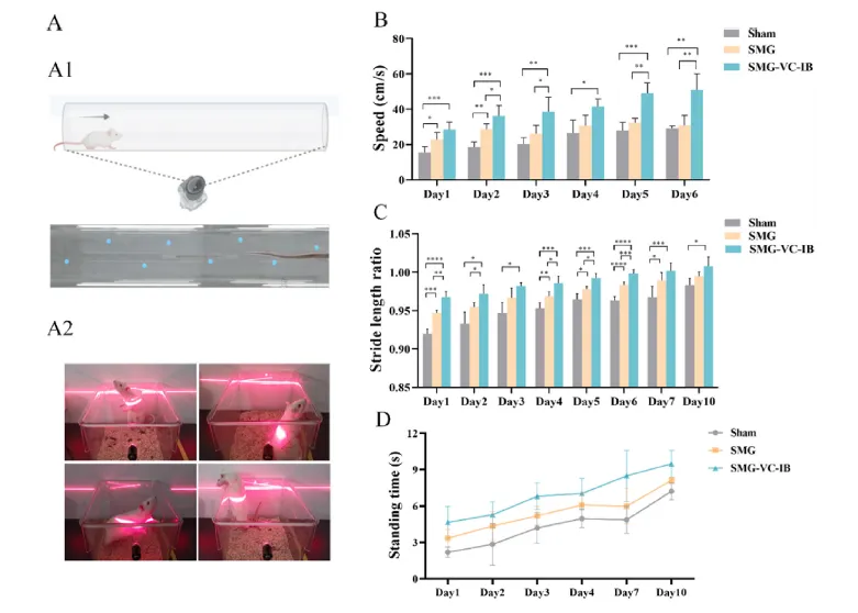 結(jié)果顯示,SMG-VC-IB組創(chuàng)面較空白組和SMG組更早進(jìn)入增值和重塑階段。SMG-VC-IB可減輕炎癥反應(yīng),進(jìn)而減輕疼痛,促進(jìn)創(chuàng)面愈合。通過(guò)測(cè)量大鼠的站立時(shí)間,結(jié)果表明站立時(shí)間越短,疼痛越嚴(yán)重。因此,SMG-VC-IB減輕了疼痛。