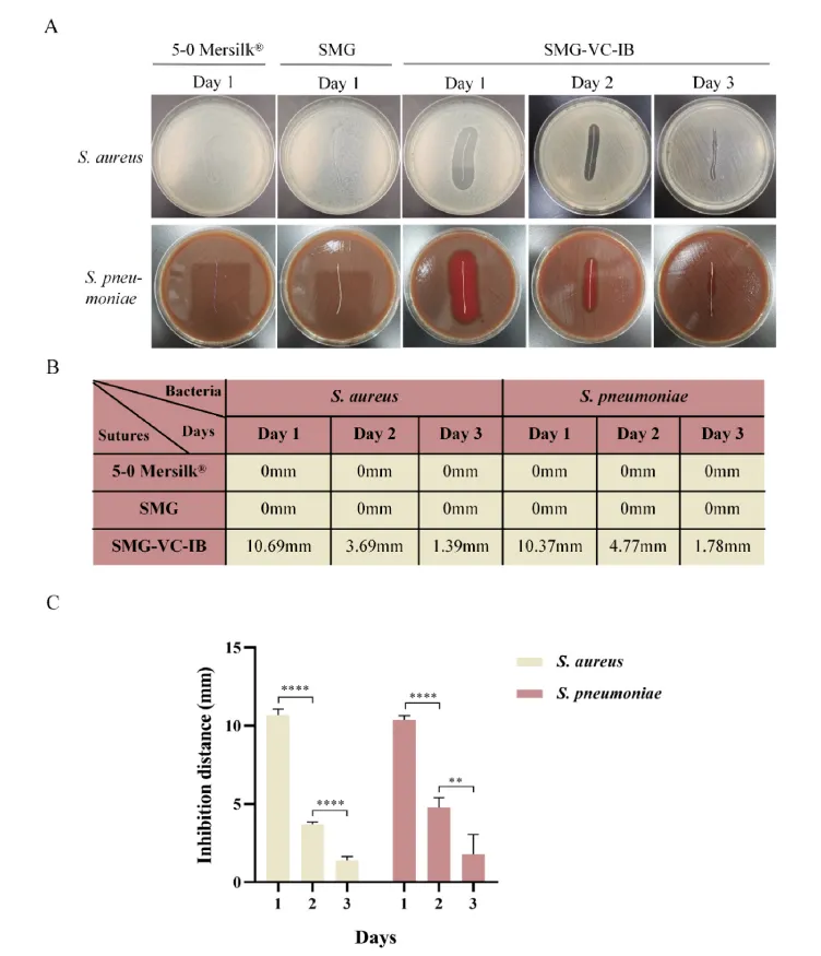 圖5結(jié)果顯示,5-0 Mersilk縫線和SMG縫線在金黃色葡萄球菌和肺炎鏈球菌培養(yǎng)板上均未顯示出明顯的抑制圈,SMG-VC-IB對(duì)這些細(xì)菌板有明顯的抑制作用。隨著濃度的降低,抑制效果越來(lái)越小。
