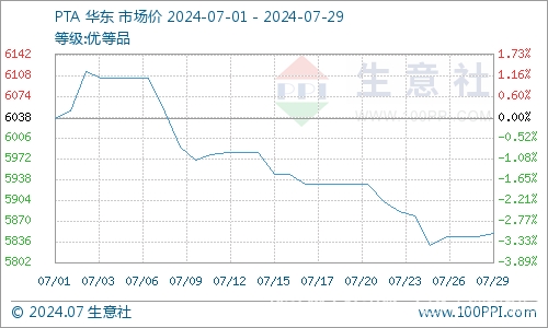 同時,滌綸短纖主原料PTA和副原料乙二醇價格皆有下跌。其中PTA裝置變動對其供應(yīng)影響有限,貨源仍顯充裕,行業(yè)開工率在82%附近。價格方面,截止7月29日華東地區(qū)現(xiàn)貨市場均價在5850元/噸,較7月初下跌3.11%。