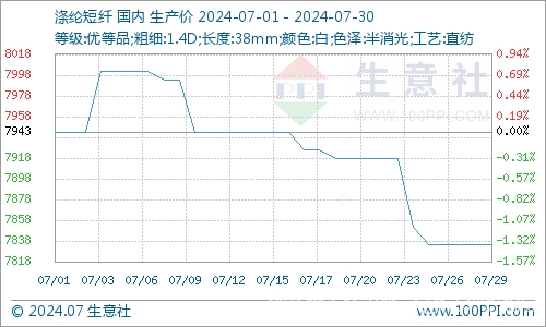 近期國內(nèi)滌綸短纖市場價格維持偏弱調(diào)整,截止7月29日國內(nèi)滌綸短纖主流工廠1.4D*38mm均價在7835元/噸,較7月22日下跌1.05%。成本下跌、需求偏弱,對滌綸短纖價格形成打擊,導(dǎo)致價格下行。