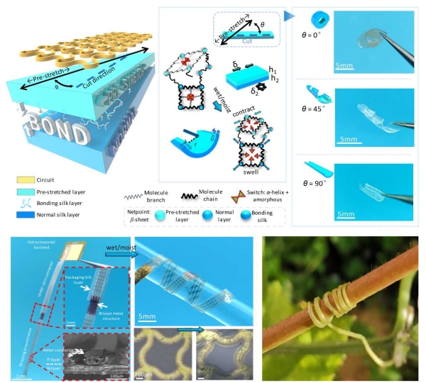 近日,中國科學(xué)院上海微系統(tǒng)與信息技術(shù)研究所研究員陶虎團(tuán)隊在高適應(yīng)性蠶絲蛋白神經(jīng)接口研究方面取得進(jìn)展。團(tuán)隊與上海交通大學(xué)醫(yī)學(xué)院附屬第六人民醫(yī)院合作,基于蠶絲蛋白材料開發(fā)了一種具有高度組織/器官適配性的植入式生物電子器件。在保留絲蛋白材料良好生物相容性的基礎(chǔ)上,利用蠶絲蛋白材料的超收縮特性與鍵合工藝實(shí)現(xiàn)了器件的水觸發(fā)可控幾何重構(gòu),進(jìn)一步實(shí)現(xiàn)了器件與目標(biāo)組織或器官在幾何結(jié)構(gòu)與功能上的匹配。相關(guān)研究成果以Tissue/Organ Adaptable Bioelectronic Silk-Based Implants為題,于7月22日發(fā)表在《先進(jìn)材料》(Advanced Materials)期刊上。