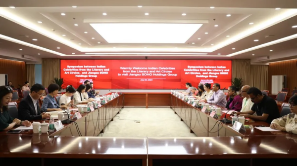 7月29日,應(yīng)中國人民對外友好協(xié)會邀請,印度著名指揮家、作曲家維杰·烏帕德亞雅帶隊的印度文藝界知名人士代表團到訪蘇豪控股集團。集團黨委副書記陳萬寧攜蘇豪文化集團熱情接待。雙方就中印民間現(xiàn)代文化交往進行了輕松友好的交流。
