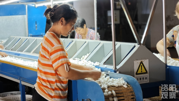 下午1點,記者走進(jìn)該廠區(qū)的選繭車間時,數(shù)名工人正在挑選剛從樂至養(yǎng)蠶大戶手中收購來的蠶繭。經(jīng)過機(jī)械粗選、人工精選兩層篩選,色澤潔白、個頭飽滿、繭層厚重的優(yōu)質(zhì)蠶繭將會在這里經(jīng)歷由繭到絲的奇妙之旅。