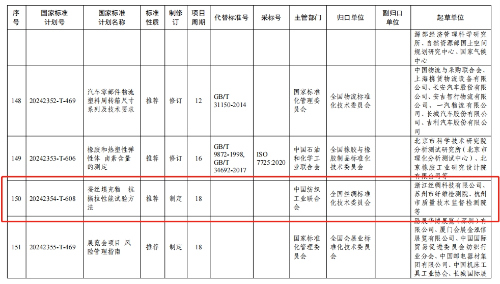 7月25日,國(guó)家標(biāo)準(zhǔn)化管理委員會(huì)以國(guó)標(biāo)委發(fā)[2024] 32號(hào)文下達(dá)推薦性國(guó)家標(biāo)準(zhǔn)計(jì)劃共計(jì)195項(xiàng),推薦性標(biāo)準(zhǔn)190項(xiàng)、指導(dǎo)性技術(shù)文件5項(xiàng),外文版(英文)計(jì)劃38項(xiàng)。全國(guó)絲綢標(biāo)準(zhǔn)化技術(shù)委員會(huì)歸口的《蠶絲填充物 抗撕拉性能試驗(yàn)方法》國(guó)家標(biāo)準(zhǔn)制定計(jì)劃位列其中。