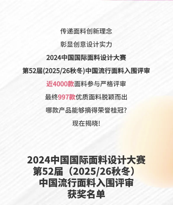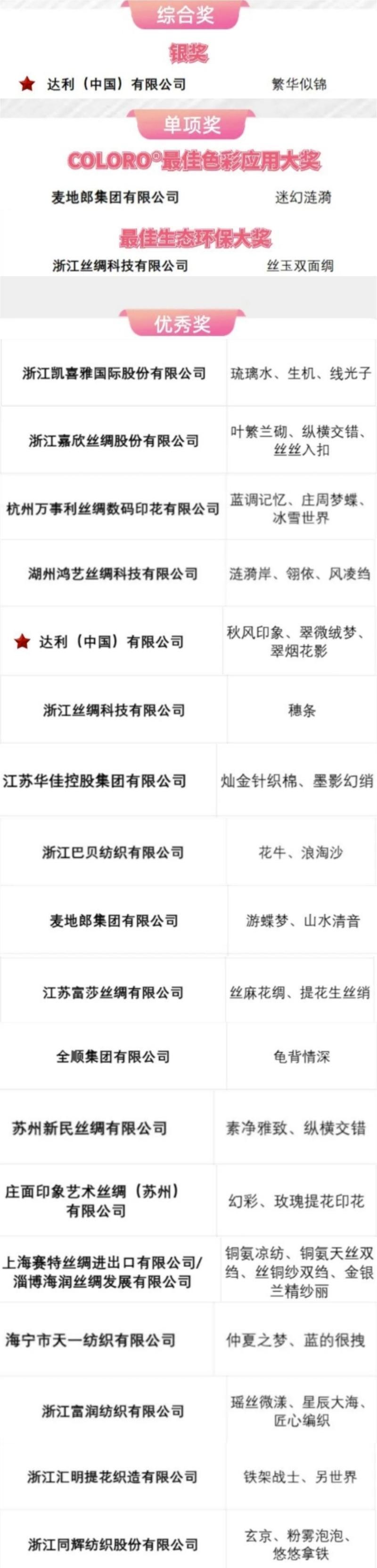 行業(yè)新聞丨達(dá)利等多家絲綢企業(yè)入圍第52屆(2025/26秋冬)中國流行面料獲獎(jiǎng)名單