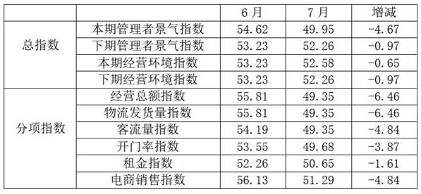 從商戶景氣指數(shù)來(lái)看,總指數(shù)中,7月商戶景氣指數(shù)為49.73,較上月下降0.64個(gè)百分點(diǎn);經(jīng)營(yíng)環(huán)境指數(shù)為54.40,較上月上升1.31個(gè)百分點(diǎn)。