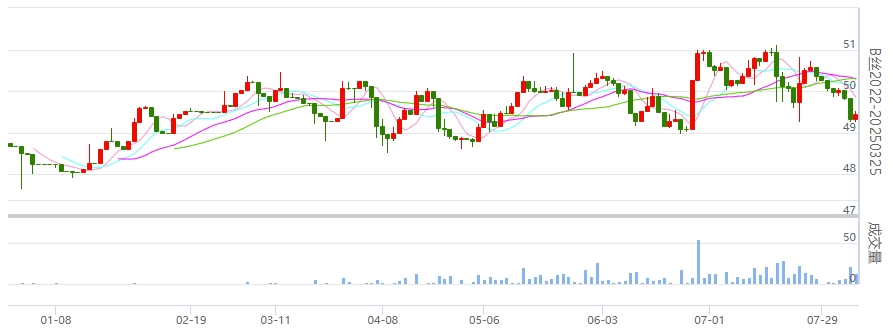 今日(2024年08月06日,周二)中國繭絲綢交易市場生絲電子指數(shù)下跌0.21%報4982.45點。B絲2022D(商檢4A級生絲):240825合約下跌0.12萬元報收于50.49萬元;240925合約報平收于49.47萬元;250325合約上漲0.12萬元報收于49.44萬元。
