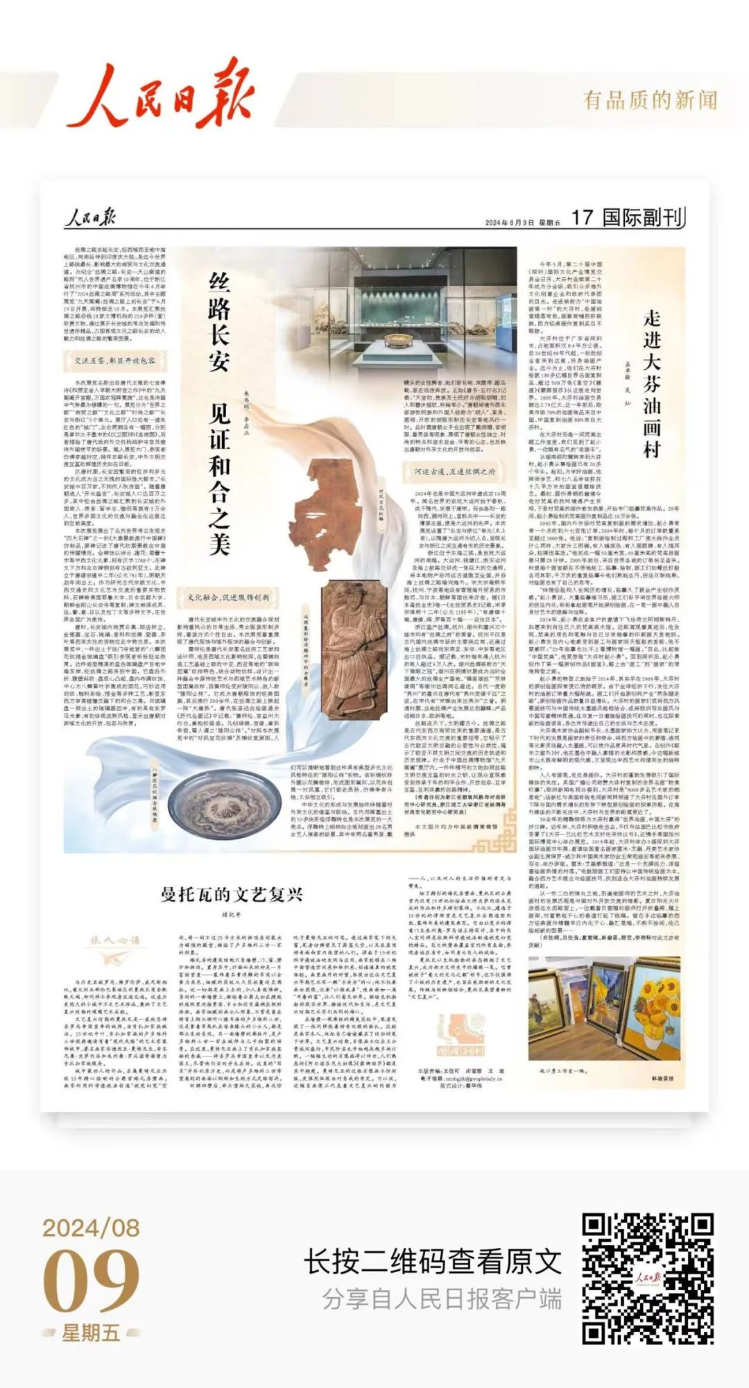 為紀(jì)念“絲綢之路:長(zhǎng)安—天山廊道的路網(wǎng)”列入世界遺產(chǎn)名錄10周年,位于浙江省杭州市的中國(guó)絲綢博物館在今年6月舉行了“2024絲綢之路周”系列活動(dòng),其中主題展覽“九天閶闔:絲綢之路上的長(zhǎng)安”于6月19日開展,將持續(xù)至10月。本展覽匯聚絲綢之路沿線18家文博機(jī)構(gòu)的210多件(套)珍貴文物,通過展示長(zhǎng)安城的考古發(fā)掘和傳世遺存精品,力圖再現(xiàn)文化之都長(zhǎng)安的動(dòng)人魅力和絲綢之路的繁榮圖景。