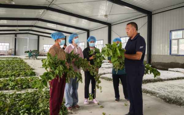 新疆和田蠶??茖W(xué)研究所的技術(shù)人員正在為工作人員講解蛋白桑的種植方法和管理技巧