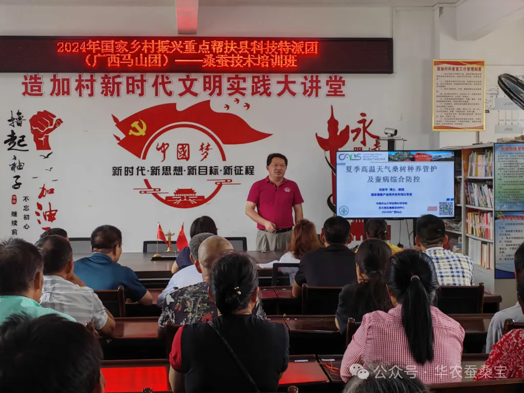 緊接著,劉吉平教授前往馬山縣永州鎮(zhèn)造加村,為村民們帶來了一場以“應(yīng)對夏季高溫,桑樹種養(yǎng)精細(xì)管理及蠶病全面預(yù)防”為主題的專業(yè)技術(shù)培訓(xùn)講座。在講座過程中,劉教授系統(tǒng)闡述了桑樹栽培護(hù)理的要點(diǎn)、桑樹病蟲害的有效防控策略以及蠶病預(yù)防的綜合措施,使與會者受益匪淺。