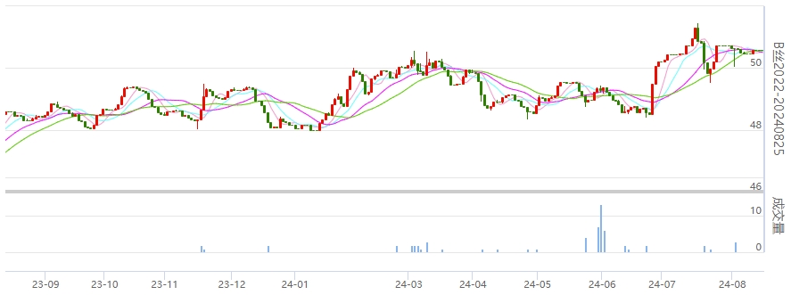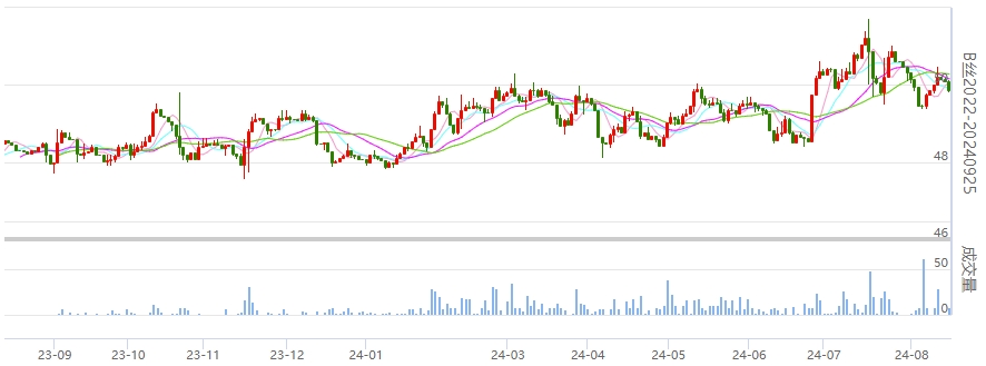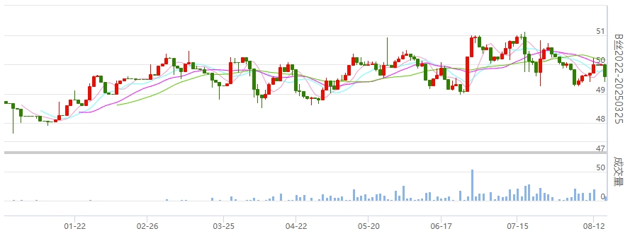 今日(2024年08月15日,周四)中國繭絲綢交易市場生絲電子指數(shù)下跌0.20%報(bào)4995.66點(diǎn)。B絲2022D(商檢4A級(jí)生絲):240825合約報(bào)平收于50.58萬元;240925合約下跌0.24萬元報(bào)收于49.86萬元;250325合約下跌0.42萬元報(bào)收于49.59萬元。