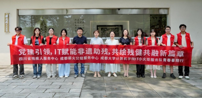 成都大學計算機學院IT小火炬服務隊主要由學生黨員、預備黨員、入黨積極分子組成,是學院黨建育人實踐隊伍,于2023年獲評校級志愿服務隊?!包h建引領,IT賦能非遺助殘”主題社會實踐活動,旨在運用計算機技術,感受非遺文化、品味非遺藝術品、宣傳殘疾人勵志故事,為非遺助殘貢獻青春力量的同時,激勵廣大學子爭當新時代好青年。這一期是“蜀繡助殘”,明天我們還有“羌秀助殘”的直播活動,并結合實地調研成果,開發(fā)一款具有非遺特色的殘疾人社交APP,將專業(yè)知識運用到實際生活中,助力殘健共融。