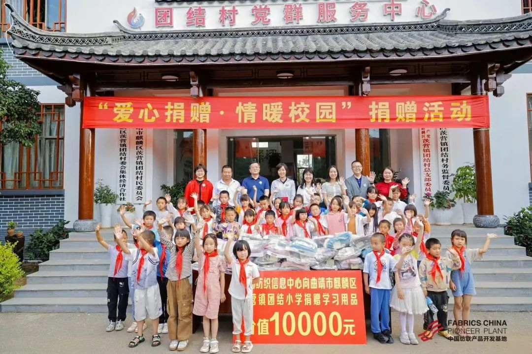 活動當(dāng)天,還舉辦了一場以“愛心捐贈 · 情暖校園”為主題的捐贈儀式。在茨營鎮(zhèn)、盛澤鎮(zhèn)政府領(lǐng)導(dǎo)、紡織產(chǎn)業(yè)鏈企業(yè)家、團結(jié)小學(xué)師生們的現(xiàn)場見證下,中國紡織信息中心向曲靖市麒麟?yún)^(qū)茨營鎮(zhèn)團結(jié)小學(xué)捐贈了價值1萬元的書包、水杯、文具等學(xué)習(xí)用品共計60套。