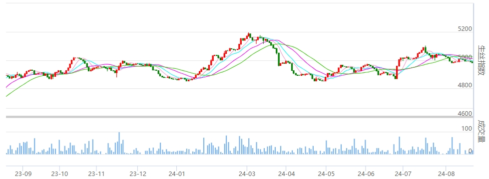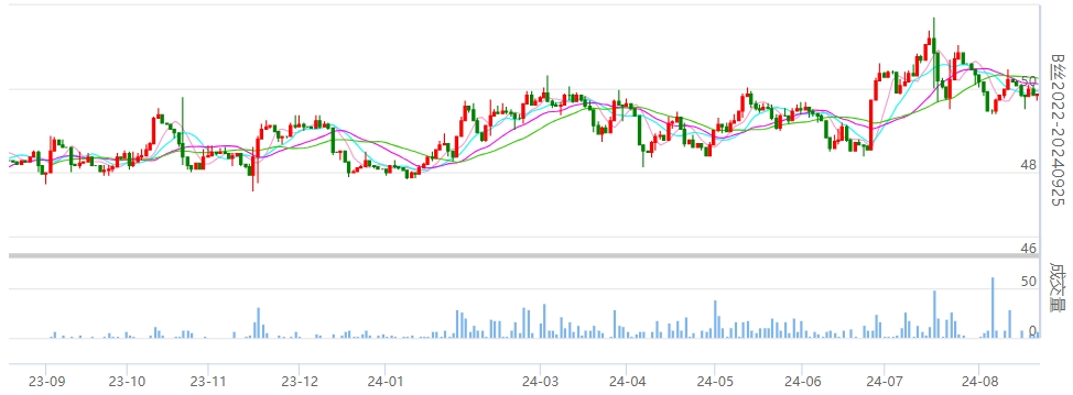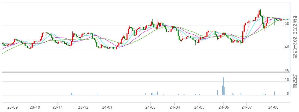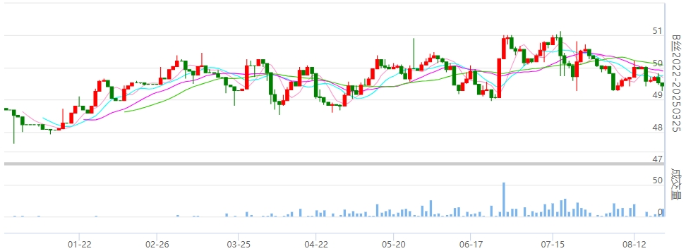 今日(2024年08月21日,周三)中國(guó)繭絲綢交易市場(chǎng)生絲電子指數(shù)微跌0.16%報(bào)4981.63點(diǎn)。B絲2022D(商檢4A級(jí)生絲):240825合約報(bào)平收于50.58萬(wàn)元;240925合約上漲0.03萬(wàn)元報(bào)收于49.89萬(wàn)元;250325合約下跌0.09萬(wàn)元報(bào)收于49.44萬(wàn)元。