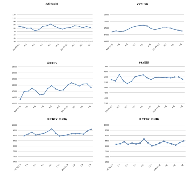 2023年1月~2024年7月我國(guó)化纖長(zhǎng)絲、棉花、PTA期貨及布倫特原油價(jià)格走勢(shì) 單位:美元/桶、元/噸