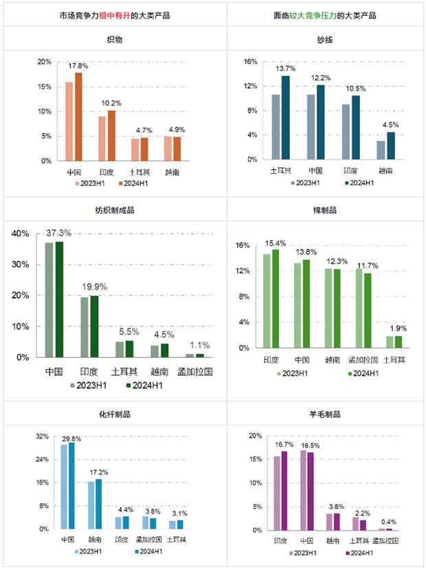 今年以來(lái),我國(guó)紡織行業(yè)面臨的外部形勢(shì)較為復(fù)雜,海外市場(chǎng)需求疲弱、國(guó)際貿(mào)易摩擦加劇等風(fēng)險(xiǎn)因素帶動(dòng)行業(yè)國(guó)際貿(mào)易環(huán)境不穩(wěn)定不確定因素明顯增多。但受益于行業(yè)自身體系完備、高效協(xié)同的產(chǎn)業(yè)優(yōu)勢(shì)及全球領(lǐng)先的制造優(yōu)勢(shì),行業(yè)國(guó)際市場(chǎng)競(jìng)爭(zhēng)力持續(xù)釋放,上半年我國(guó)紡織品服裝在美國(guó)、歐盟進(jìn)口市場(chǎng)中所占份額小幅提升,在日本進(jìn)口市場(chǎng)中所占份額微降。