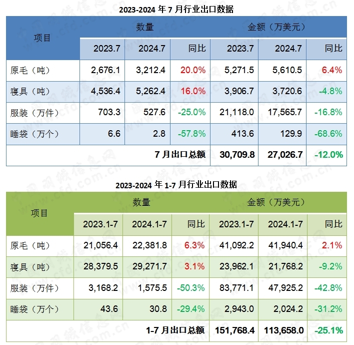 綜合1-7月來看,行業(yè)出口總額約11.4億美元,同比下滑25.1%,降幅環(huán)比1-6月繼續(xù)縮窄3.3個百分點。其中,原毛出口量小幅增長,同比上漲6.3%,出口額約4.2億美元,同比上漲2.1%。寢具出口量同比上漲3.1%,但出口額下滑約9.2%。服裝出口下滑明顯,出口量下降一半,出口額下滑約42.8%,但環(huán)比1-6月,出口數(shù)量和金額下滑幅度均略有降低。