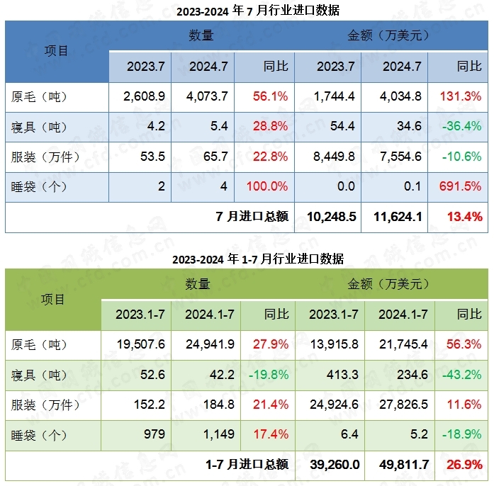 綜合1-7月來看,全行業(yè)進口約5.0億美元,同比上漲26.9%。其中,原毛進口量同比上漲27.9%,服裝進口量同比上漲21.4%,寢具進口量同比下降19.8%。