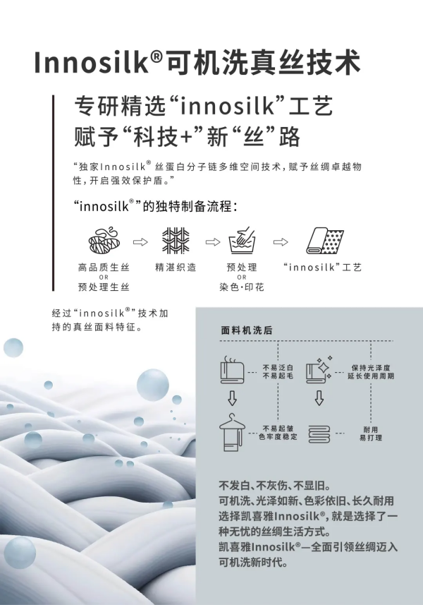 這是繼2023年凱喜雅集團(tuán)發(fā)布的具有自主知識(shí)產(chǎn)權(quán)的前沿科技成果——Innosilk?可機(jī)洗真絲技術(shù)后,為國(guó)內(nèi)外絲綢行業(yè)樹(shù)立的又一里程碑。
