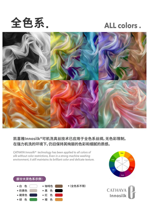 凱喜雅Innosilk?可機(jī)洗真絲技術(shù)已應(yīng)用于全色系絲綢,無(wú)色彩限制,且固色能力強(qiáng),在機(jī)洗的環(huán)境下,仍舊保持其絢麗的色彩和細(xì)膩的質(zhì)感。已大貨顏色包含白色、奶黃色、橙色、紅色、綠色、藏青色、咖啡色、黑色等。全色系不限。