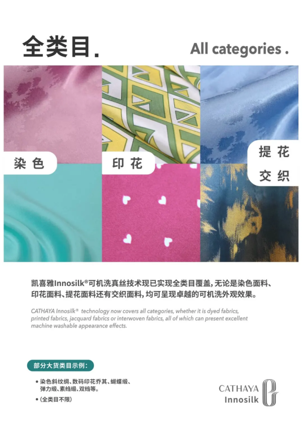 凱喜雅Innosilk?可機(jī)洗真絲技術(shù)現(xiàn)已實(shí)現(xiàn)全類(lèi)目覆蓋,無(wú)論是染色面料、印花面料、提花面料還有交織面料,均可呈現(xiàn)卓越的可機(jī)洗外觀效果。已大貨面料包含染色斜紋綢、數(shù)碼印花喬其、蝴蝶緞、彈力緞、素縐緞、雙縐等類(lèi)目。全類(lèi)目不限。