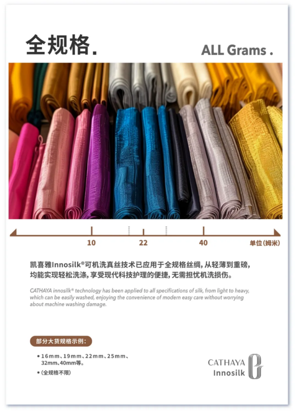 凱喜雅Innosilk?可機(jī)洗真絲技術(shù)已應(yīng)用于全規(guī)格絲綢,從輕薄到重磅,均能實(shí)現(xiàn)輕松洗滌,享受現(xiàn)代科技護(hù)理的便捷,無(wú)需擔(dān)憂機(jī)洗損傷。已大貨規(guī)格包含16mm、19mm、22mm、25mm、32mm、40mm等。全規(guī)格不限。