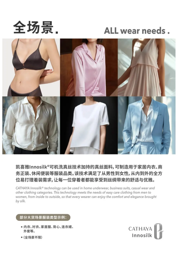 凱喜雅Innosilk?可機(jī)洗真絲技術(shù)拓寬了真絲面料的家居、社交、休閑等使用場(chǎng)景,給品牌方和設(shè)計(jì)師帶去更多選擇可能性。傳統(tǒng)真絲面料因其不易打理的特性,適用場(chǎng)景很局限,而經(jīng)過(guò)Innosilk?可機(jī)洗技術(shù)加持后的真絲面料耐洗耐磨,可用于制造商務(wù)正裝、休閑便裝、家居內(nèi)衣等服裝品類(lèi),滿足了從男性到女性,從內(nèi)到外的全方位易打理著裝需求,讓每一位穿著者都能享受到絲綢帶來(lái)的舒適與優(yōu)雅。已大貨服裝品類(lèi)包含內(nèi)衣、襯衣、家居服、連衣裙、外套等。全場(chǎng)景不限。