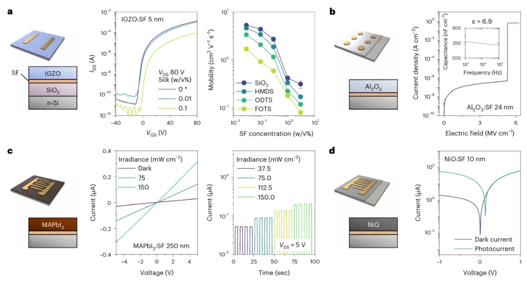 圖4 使用絲表面活性劑的水激活納米器件?;贗GZO:SF的場(chǎng)效應(yīng)晶體管(FET)。中間:用不同的晶體管的轉(zhuǎn)移曲線。右圖:不同 SF 晶體管的電荷遷移率。數(shù)據(jù)點(diǎn)和誤差條顯示平均值±s.d.(樣本數(shù)為 3)。以及制備的 MAPbI3 的薄膜的 I-V 特性。d, 基于 NiO:SF 的光電探測(cè)器的結(jié)構(gòu)(左)和在不同側(cè)向電壓(中)和時(shí)間(右)下的光探測(cè)器的結(jié)構(gòu)(左)及其在白光照明下的 I-V 特性(右)。(右圖)。所有器件都是在疏水性基底上制造的SF 基絕緣體的結(jié)構(gòu)(左)及其電流密度-電場(chǎng)曲線。