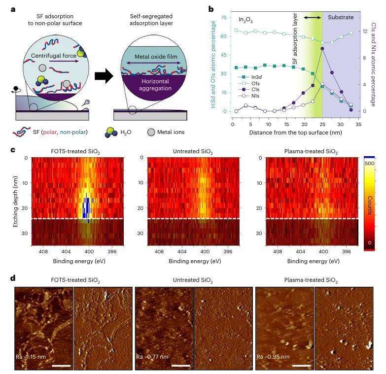 圖3 絲綢表面活性劑在薄膜-固體界面的自適應(yīng)吸附。a, 表面活性劑在涂覆過(guò)程中的自分離示意圖。b, XPS 深度剖面化學(xué)成分分析 厚度為 25 納米的 In2 O3薄膜的化學(xué)成分分析。數(shù)據(jù) c, N1s 在 In2O3薄膜中的 N1s 分布。SF 沉積在具有不同自由表面能的基底上的 In2 O3 薄膜中的 N1s 分布。白色虛線線表示與二氧化硅d,通過(guò)選擇性蝕刻金屬氧化物獲得的埋藏 SF 層的高度和偏轉(zhuǎn) AFM圖,通過(guò)選擇性蝕刻金屬氧化物獲得(比例尺,1 μm;Ra,平均值;Ra,算術(shù)平均粗糙度)。