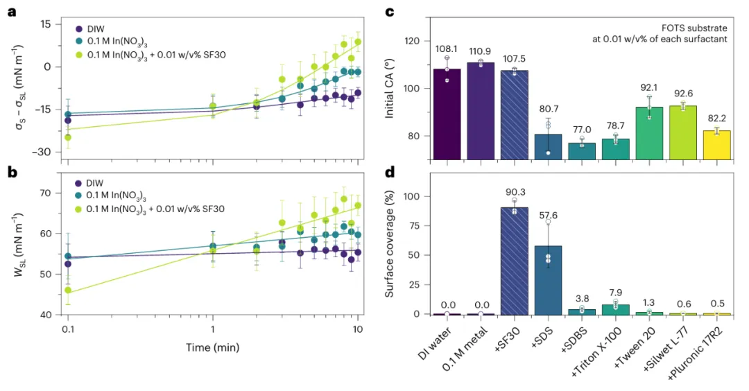 從熱力學(xué)角度來(lái)看,潤(rùn)濕是液體在固體表面擴(kuò)展以最小化自由能的現(xiàn)象。液體在固體上的潤(rùn)濕性可通過(guò)界面能和粘附功來(lái)評(píng)估,分別由楊氏方程和粘附功方程表示。本文評(píng)估了含絲素蛋白(SF)溶液在疏水性基底上的表面張力和接觸角(CA)變化,使用煮沸30分鐘的SF(SF30)。結(jié)果顯示,盡管SF30溶液的表面張力變化與對(duì)照組相似,但其接觸角顯著降低(補(bǔ)充圖2),表明潤(rùn)濕增強(qiáng)主要通過(guò)改變液-固界面能實(shí)現(xiàn),而非降低溶液表面張力。圖2a顯示,SF摻雜溶液與固體表面之間的界面能顯著降低,圖2b顯示界面粘附力增加。與六種商用表面活性劑相比,盡管它們有效降低了溶液表面張力,但對(duì)界面能的控制不及SF(圖2c,d)。SF30在疏水性基底上的表面覆蓋率超過(guò)90%,且優(yōu)于分子量相近的合成表面活性劑(延伸數(shù)據(jù)圖1)。