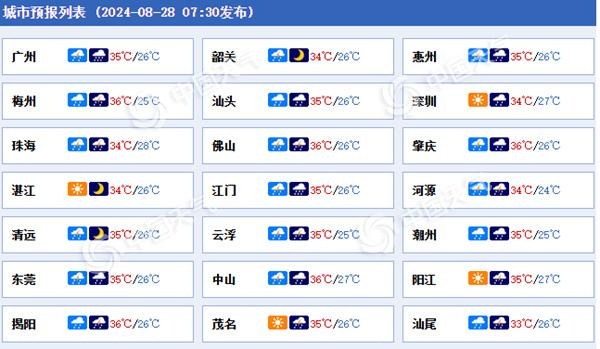 廣東未來三天(8月28日至30日)雷雨天氣頻繁,局部有暴雨或大暴雨,并伴有8級(jí)左右雷雨大風(fēng)等強(qiáng)對流天氣,需注意防范。隨著降雨增多,廣東高溫將有所緩解,但天氣仍然炎熱,需注意防暑降溫。