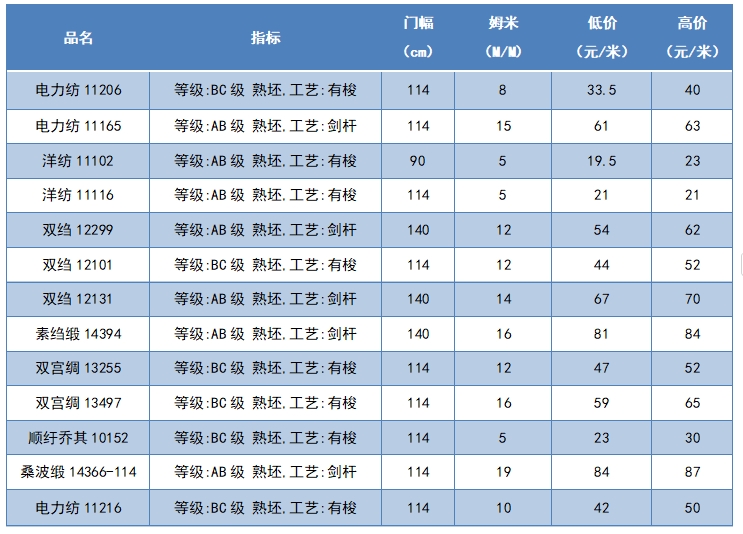 本周綢緞指數(shù)協(xié)作單位成交價(jià)格區(qū)間