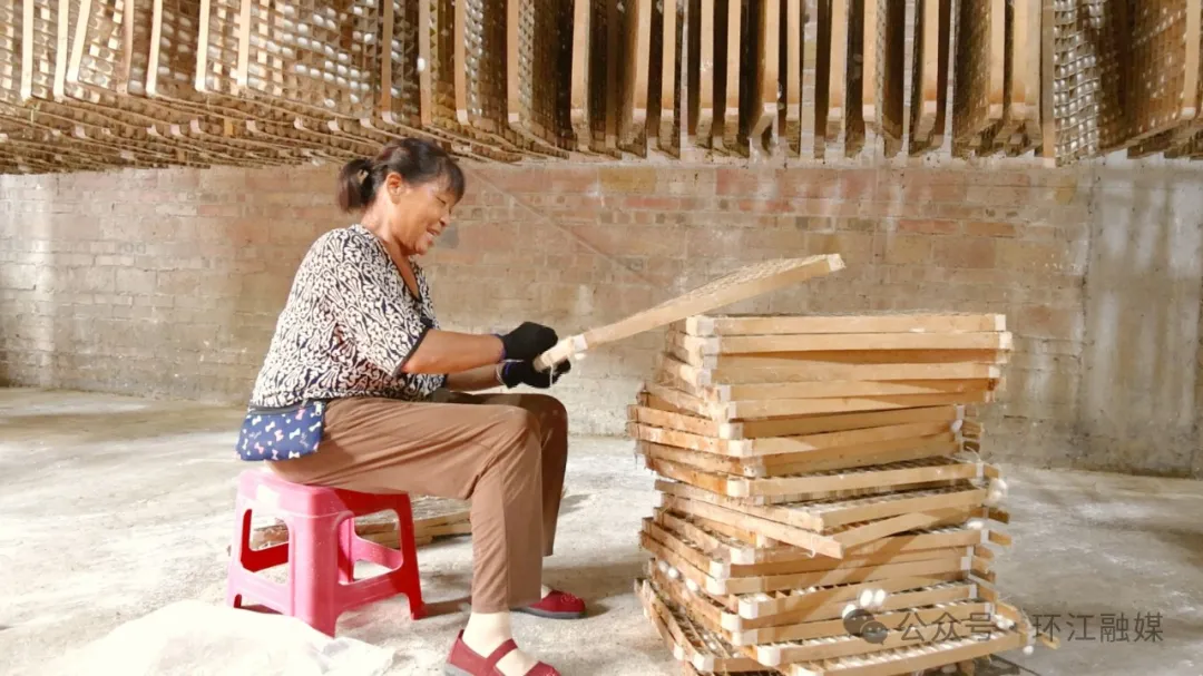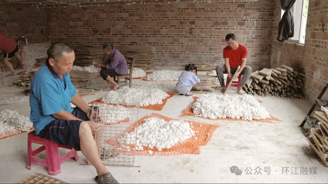 “這是今年下半年養(yǎng)的第一批蠶。我養(yǎng)了兩張,養(yǎng)得挺好的,這批大概有500斤。我們家就兩個(gè)勞動(dòng)力,還請(qǐng)了4個(gè)人來幫忙摘蠶繭。目前,我們一個(gè)月可以養(yǎng)兩批,現(xiàn)在第二批拿回來也有三天了?!表f建波說。
