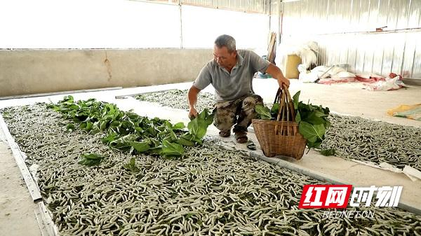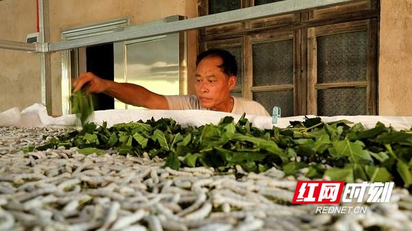 “投入成本和收入大概是1比10 。打個比方,你投入1塊錢的養(yǎng)殖成本,大概能賣回10塊錢收入?!币皇痔嶂窕@,一手給大蠶均勻投喂桑葉的肖承權(quán)介紹說,這是他養(yǎng)殖的第七批蠶,即將吐絲結(jié)繭,企業(yè)上門收購蠶繭后,便可養(yǎng)殖下一批蠶。