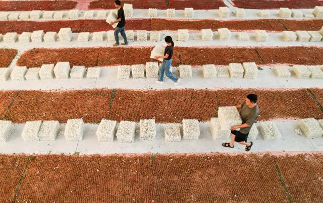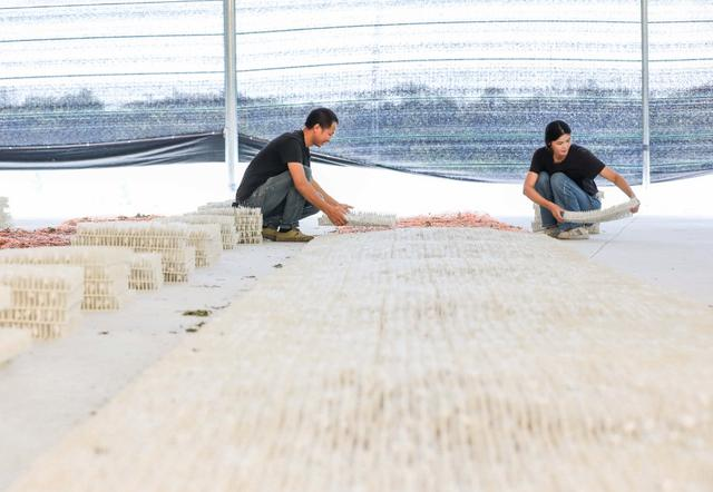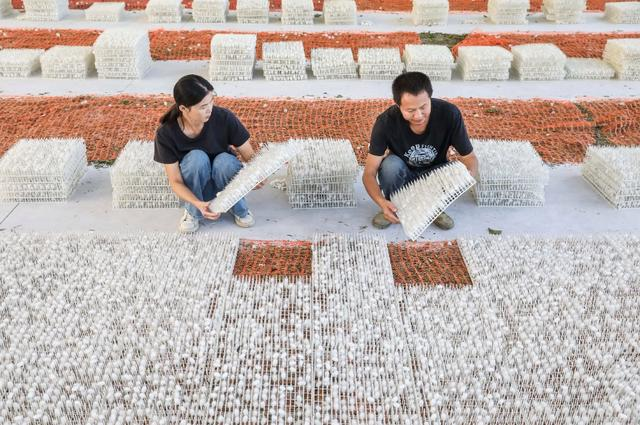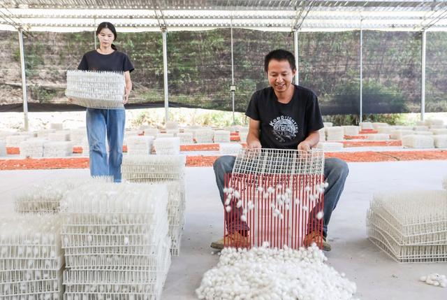 9月12日,墊江縣五洞鎮(zhèn)文龍村桑蠶基地,工人在收獲第一批蠶繭。