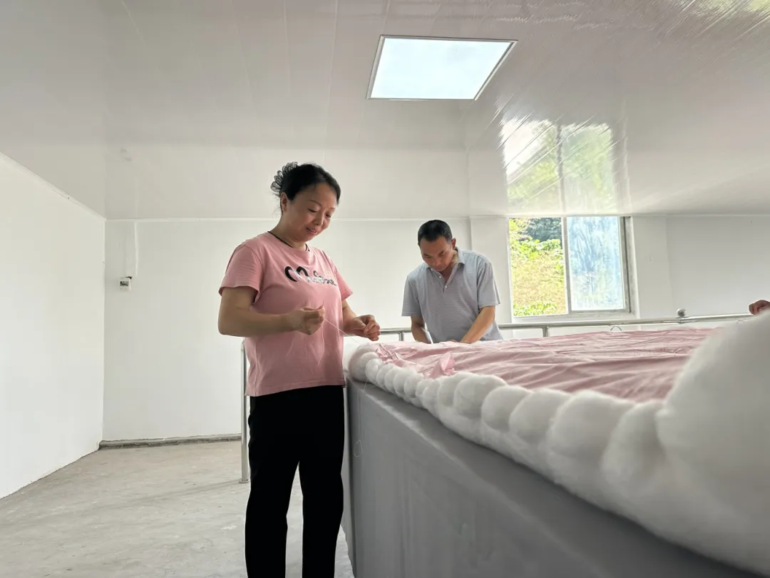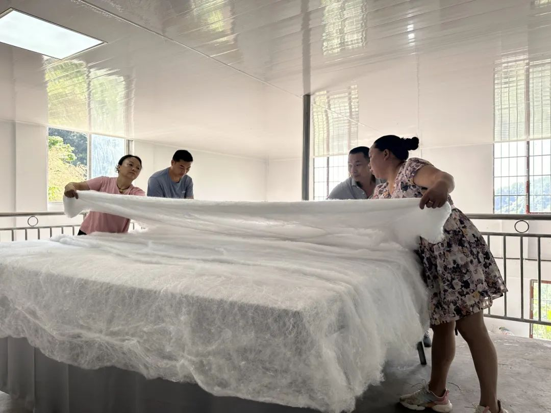 在村集體經(jīng)濟(jì)合作社的統(tǒng)一管理下,雙橋村干部帶頭主動學(xué)習(xí)蠶絲被制作技藝,從蠶種培育、飼養(yǎng)管理到蠶繭收烘、疾病防治,每一個環(huán)節(jié)都力求精益求精。為村集體桑蠶產(chǎn)業(yè)的發(fā)展奠定了堅(jiān)實(shí)基礎(chǔ)。