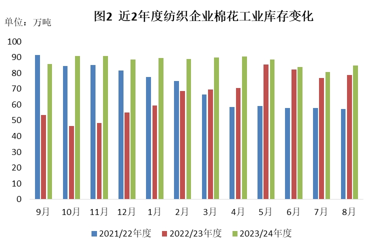8月棉價下跌,但紗廠訂單有所回暖,部分企業(yè)低位補(bǔ)庫意愿增強(qiáng),原料庫存小幅增加。截至8月31日,紡織企業(yè)在庫棉花工業(yè)庫存量為84.92萬噸,環(huán)比增加4.22萬噸,同比增加6.08萬噸。其中:42%的企業(yè)增加棉花庫存,24%增加庫存,34%基本保持不變。